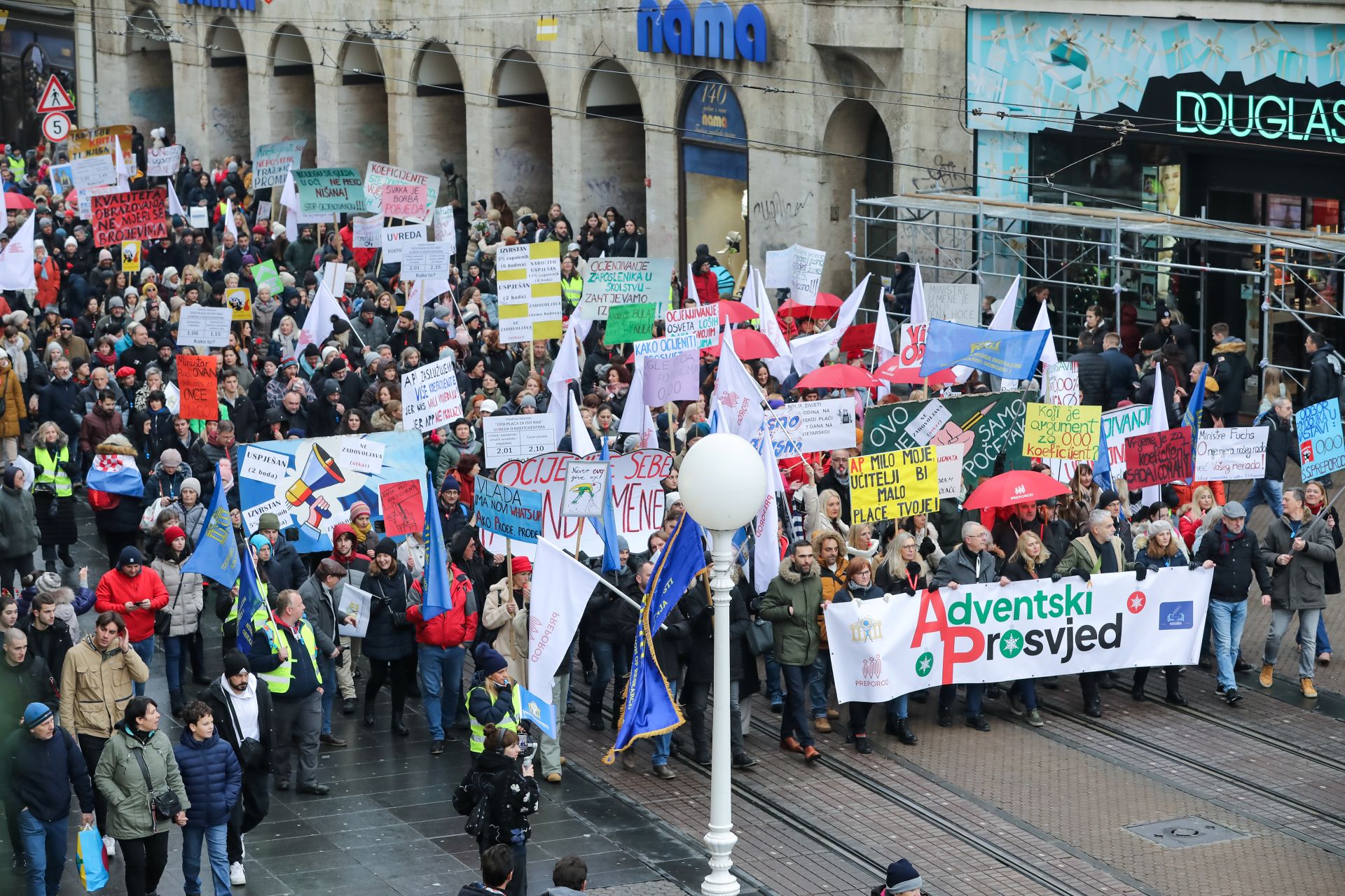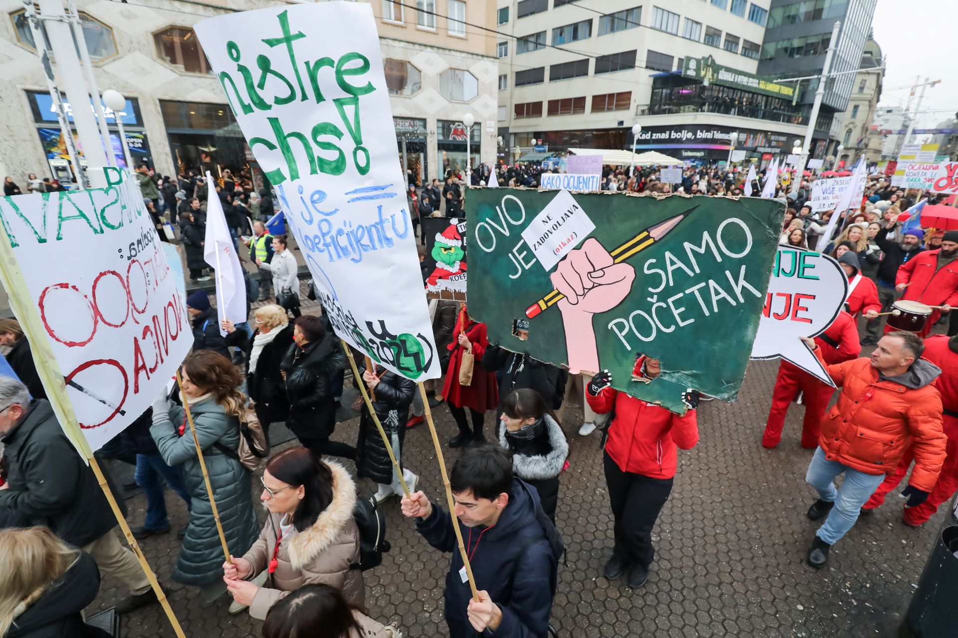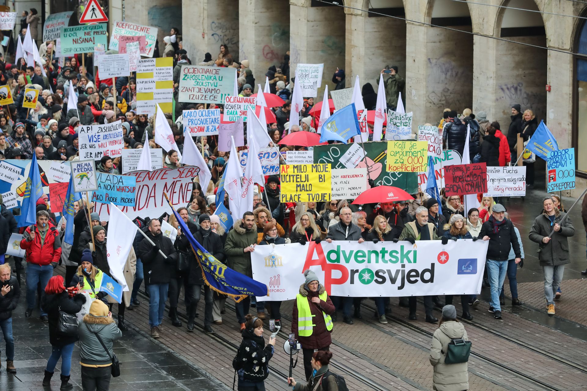 Sindikat znanosti, Školski sindikat Preporod i Nezavisni sindikat zaposlenih u srednjim školama Hrvatske u subotu su 14. prosinca na Trgu bana Josipa Jelačića u Zagrebu održali prosvjed pod sloganom ‘Adventski prosvjed protiv ocjenjivanja i nepravednih koeficijenata’ na kojem su Vladu pozvali da izuzme obrazovanje i znanost iz novog sustava ocjenjivanja te ispravi nepravde i nered koje je nanijela novim sustavom koeficijenata.
